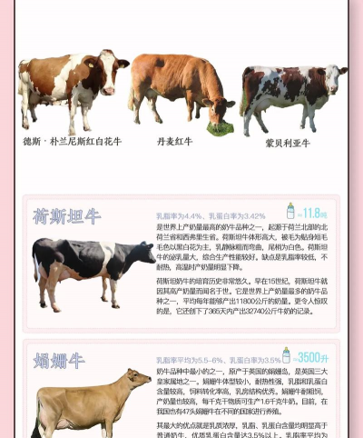 2、荷斯坦牛:原产于荷兰,是世界上大多数国家饲养的品种,荷斯坦牛的泌乳性能较强,一年能产一万千克以上。