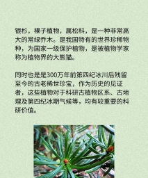 红豆杉又称紫杉,也称赤柏松。中国国家一级珍稀保护树种。红豆杉属浅根植物,其主根不明显、侧根发达。是世界上公认的濒临灭绝的天然珍稀抗癌植物。是第四纪冰川遗留下来的古老树种,在地球上已有250万年的历史。由于在自然条件下红豆杉生长速度缓慢,再生能力差,所以很长时间以来,世界范围内还没有形成大规模的红豆杉原料林基地。1994年红豆杉被中国定为一级珍稀濒危保护植物,同时被全世界42个有红豆杉的国家称为“国宝”,联合国也明令禁止采伐,是名符其实的“植物大熊猫”。