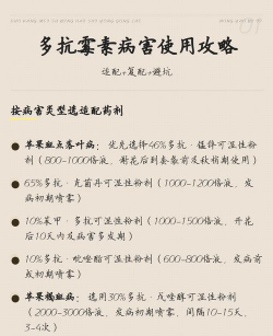 3、在治疗苹果斑点落叶病时,可每亩用10%可湿性粉剂1000-2000倍液,一般在春梢生长初期喷药,每隔1周喷1次即可。还可以把药剂与波尔多液药剂交替使用,防治效果更好。