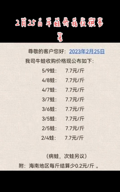 规格影响:大规格蛙(如4-8两)价格显著高于小规格蛙(2-4两)。如需更详细的分地区每日报价,可参考来源链接(如惠农网、一亩田等平台)。