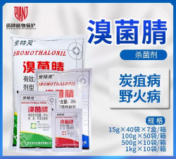 溴菌腈是一种广谱、低毒的防霉、灭藻剂,能抑制和铲除、和藻类。适用于纺织品、皮革等防腐、防霉,工业用水灭藻。对农作物病害有较好的防治,特别是对炭疽病有。适用于果树、蔬菜、棉花、茶树、烟草、花卉、药材、苗木等作物,防治炭疽病、疮痂病、轮纹病、霜霉病、黑痘病、灰霉病、疫病、溃疡病、黑星病、青枯病、角斑病、叶斑病、锈病、白粉病、蔓枯病、枯萎病、黄萎病、根茎腐病、猝倒病、赤星病等几十种病害。