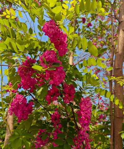 红花刺槐树冠圆满,叶色鲜绿,花朵大而鲜艳,浓香四溢,素雅而芳香,在园林绿地中广泛应用,可作为行道树,庭荫树。红花刺槐的适应性强,对灰尘、二氧化硫、烟雾等的抗性都较强,可作为防护林树种。