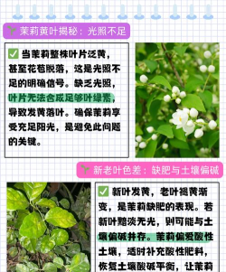 光照不足 :新叶黄绿,老叶徒长。需将茉莉移至半阴通风处,春秋提供6-9小时散射光,夏季适当遮阴。