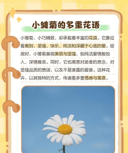 5、藏在心底的爱意:小雏菊属于迷你型花卉,它长得不起眼,就像它的花语一样,“深藏心底的爱”。如果有人送给你,则表示他暗恋你。寓意着一种藏在心底的感情。