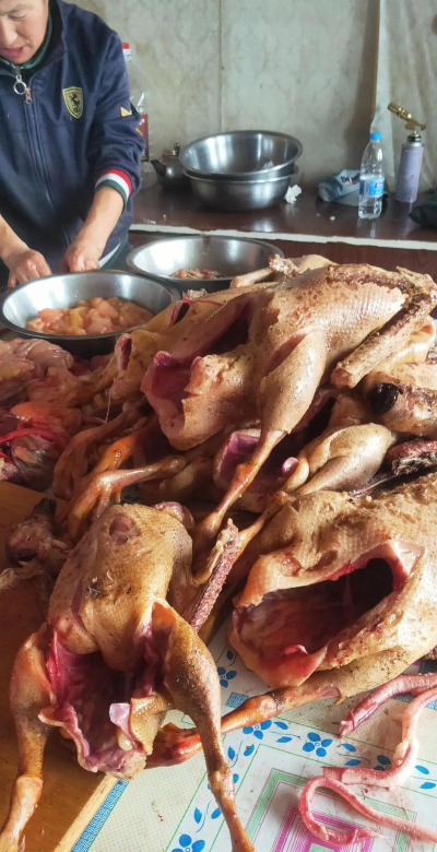 (2)让鹅脖子上的伤口保持向下,然后紧紧固定住鹅(注意鹅垂死挣扎),进行放血。