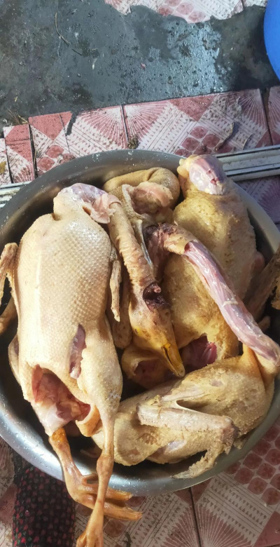 将鹅杀死之后,用冷水浸透,然后将鹅放入65-70℃左右的热水中(水温不宜过高,否则会将鹅皮烫坏,不宜拔除),浸烫2-3分钟左右,期间使用小木棒不断抖动鹅的羽毛,让热水与羽毛充分接触。浸烫结束后进行拔毛。拔毛时,一般先趁热褪去鹅脚掌和鹅嘴的老皮,然后拔去鹅翅膀上的长翎,而腋下的细小绒毛可以使用小火将其燎掉,然后用刮刀刮除干净。