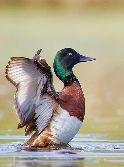 青头潜鸭是一级保护动物。被《世界自然保护联盟濒危物种红色名录》列为“极危”等级,堪称鸟类中的“大熊猫”。青头潜鸭是雁形目鸭科潜鸭属的鸟类。体圆,头大,雄鸟头和颈黑色,并具绿色光泽,眼白色。上体黑褐色,下背和两肩杂以褐色虫蠹状斑,腹部白色,与胸部栗色截然分开,并向上扩展到两胁前面,下腹杂有褐斑。两肋、淡栗褐色,具白色端斑。雌鸟体羽纯褐色。