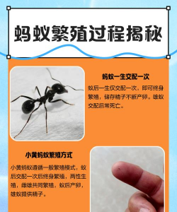 蚂蚁一般在春夏之季进行繁殖。在雨后天气闷热的傍晚,蚁巢里面就会飞出大量的长翅繁殖蚁,然后在离巢不远处的建筑物附近低飞,它们的飞行时间比较短,这种现象被称为婚飞或群飞。交配的蚂蚁会飞到地面,各自脱掉翅膀,雌雄成双追逐,一般是雌前雄后。