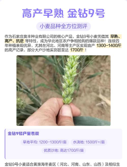 金钻九号金钻九号是一个小麦品种,该品种属半冬性早熟品种,平均生育期234天,比对照衡4399早熟2天。幼苗半匍匐,叶色深绿,分蘖力较强。成株株型紧凑,株高72.8厘米,整齐度好。穗纺锤形,长芒,白壳,白粒,硬质,籽粒饱满。亩穗数40.6万,穗粒数37.0个,千粒重39.4克。熟相较好。抗倒性较好。抗寒性较好。