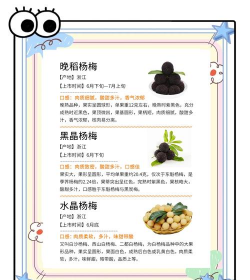 晚稻杨梅:晚稻杨梅属于杨梅科杨梅属植物,果实圆球形,完熟时紫黑色,充分成熟时近黑色。肉柱圆钝肥大,果顶微凹,果基圆形,果柄短,肉质细,汁多,甜酸适口,香气浓郁,核肉易分离。鲜食肉质细腻,甜浓带酸,香气浓郁,品质优异,鲜果食用品质极佳。