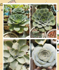 绿玉杯:较稀有,叶子是墨绿色的,表面覆盖着一层很薄的绒毛,相对于莲花掌属的其他植物较小,在自然生长状态下,一般直径在2-4cm,春季在底部会长出很多侧芽。花期在2-4月,花序可以长到12cm,花朵颜色为金黄色,花谢后母株枯萎,侧芽继续生长。