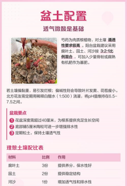 芍药喜疏松肥沃、排水良好的微酸性至中性砂质壤土(pH 6.5-7.5),忌黏土、盐碱地和低洼积水处。盆栽建议用腐叶土、园土和河沙按3:2:1比例混合,并添加骨粉或腐熟有机肥作基肥。地栽需选择地势高燥、阳光充足的位置,种植前深耕土壤并施足基肥(如腐熟厩肥或堆肥)。
