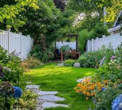 花园可以用青草铺地,石子铺路,路的两旁摆放自己喜欢的花草。
