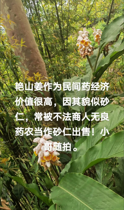 艳山姜为圆锥花序,下垂,花瓣下面为白色,顶端为粉红色,花序轴为紫红色,分枝较短,在每个分枝上都有小花,小的苞片为椭圆形。