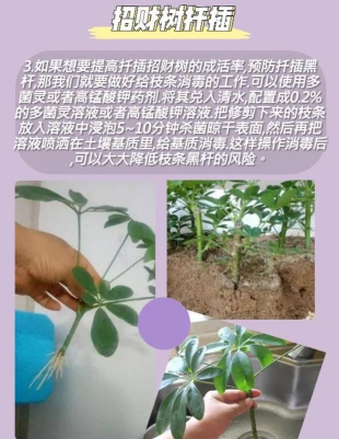 扦插完成后,要将发财树放在阴凉通风的环境中,每周浇灌一次水分,等待枝条长出新芽后,则表示扦插成活,可以为发财树施加氮肥,提高植株的生长速度,并且要将其放在散光环境下,促使发财树生长枝叶。