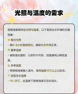 丽格海棠的生长发育适温为18℃~22℃。家庭养护重点是冬季要注意保暖,最低温度不得低于15℃。
