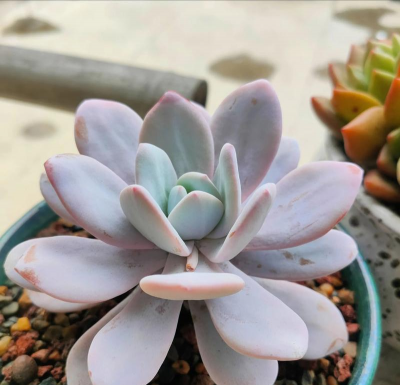 多肉雪莲是一种比较小巧的多肉植物。茎的长度在五至十厘米之间。叶片是倒卵形的,非常宽大、肥厚,不过偶尔也会出现比较尖的叶片。叶子的长度在五至八点五厘米之间,宽度一般是三至四点五厘米。在阳光充足的时候,它们的颜色会变粉。