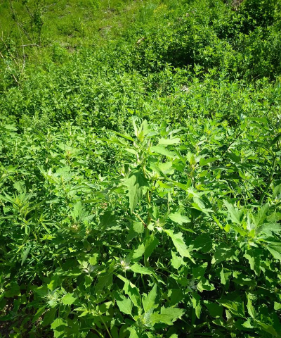 它是一类一年生的草本植物,高度在六十至一百二十厘米之间。它的茎是直立的,而且非常粗壮。它有许多分支。它的叶片是菱形的,或者是披针形的,长度三至六厘米,宽度则是二点五至五厘米。它的花朵簇生,锥形花序。果皮非常薄。