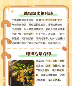 嫁接繁殖:砧木可用女贞、小叶女贞、白蜡和流苏等。大量繁殖时,北方多用小叶女贞。春季发芽前,自地面以上5厘米处剪断砧木,剪取桂花1至2年生粗壮枝条长10至12厘米,将基部两侧削成45度的斜面。在砧木一侧约三分之一处纵切一刀,深2至3厘米。将接穗插入切口内,使形成层对齐,用塑料袋绑紧,埋土培养。用小叶女贞作砧木嫁接成活率高,生长快,但易形成"小脚”现象。