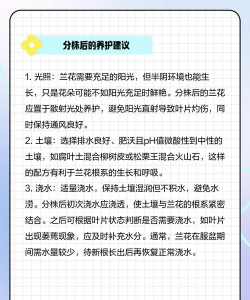 兰花适合在根系活力较低的时候,也就是开花以后发芽以前的这一段时间进行分株。之所以要在根系活力较低的时候分盆,是因为这样不容易伤到它的根系。因为不同品种的兰花开花时间不同,所以不同品种的兰花也有不同的最佳分株时间。冬季开花的品种可以在早春分株。夏季开花的品种可以在初_秋分株。