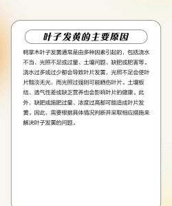 鸭脚木(又称鹅掌柴、招财树)出现黄叶的原因多样,通常与养护环境和管理不当有关。以下是常见原因及简要分析: