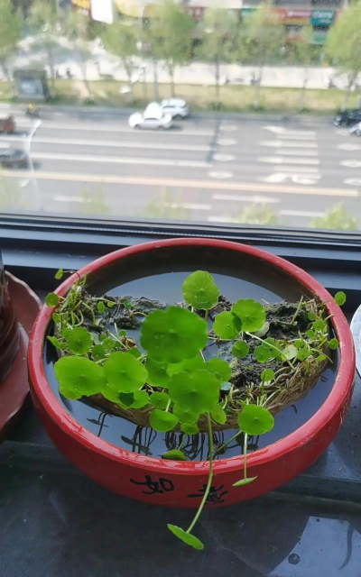水培铜钱草:需定期修剪过长或腐烂的根系,保留健康白根,并更换清水。