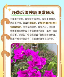 开花的三角梅消耗的水分多,发现土壤干要及时浇水。正常情况下间隔三五天就要浇水一次,满足对水分的需求才可旺盛生长,花色也会更加娇艳,还可延长花期。注意,每次浇水只要浇透就行,不可有积水情况。三角梅在开花期间还要多晒太阳,最好给予全日照。花期消耗的养分多,但是开花不可追肥,应在花期前后补肥。