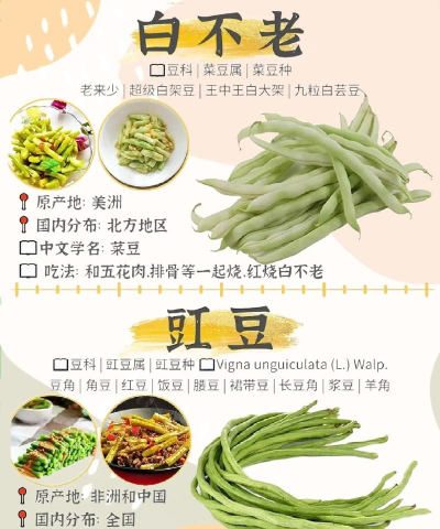 特点:扁平短小,分绿荚、白荚和红荚型,膳食纤维突出,适合炒或焖。