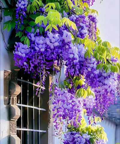 花:总状花序下垂,长15-30厘米,花冠蝶形,紫色或深紫色,基部有2枚胼胝体,芳香浓郁。花期4-5月,盛花时如紫色瀑布。