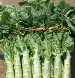 莴笋又名莴苣、千金菜、茎用莴苣、莴苣笋、莴菜、香莴笋等,为菊科草本植物莴笋的茎叶。是莴苣的一个变种,分为白莴笋、尖叶莴笋、花叶莴笋等品种。性凉,味甘微苦,清热利尿,活血通乳。莴笋是一二年生草本植物,原产于地中海沿岸,唐代传入我国,我国南北均产,冬、春季采收,是春季及秋冬季的主要蔬菜之一。莴笋以肥大的花茎基部供食,呈长棒形,外有一层纤维层。对嫩茎起着保护作用,茎质脆、嫩,水分大,味鲜美。莴笋的品种较多,依叶形大体分为尖叶类和圆叶类。