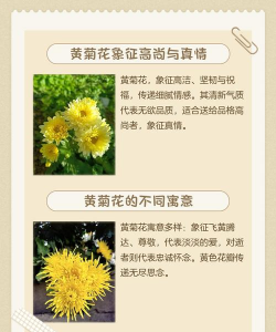 黄菊花的花语和寓意有怀念、悼念、坚强、单相思、清静、优雅绅士、高洁之士、高雅尊敬。黄菊花还有代表清淡飘逸的处世风格,通常用来形容那些与世无争,喜欢清静之人,所以不少文人墨客都喜欢借菊抒情,表达自己的情怀。
