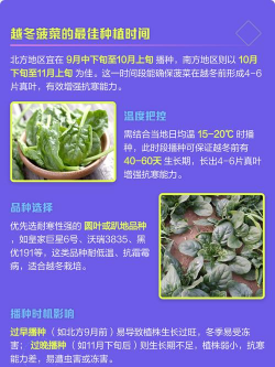 越冬菠菜一般在每年的10月中旬-11月上旬播种,具体的种植时间还需要根据当地的气候、温度作出一定的调整。越冬菠菜播种,种子在土壤中越冬,当年不发芽(播前不可催芽)次年,3月初即可陆续出苗,收获后的种株,在干燥的地方堆置几天时间,以待种子后熟,然后抢晴天让其充分干燥苗,采用此法,种子产量较低,但占地时间短。