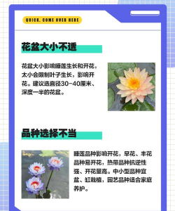 睡莲发生不开花的现象,多是以下四种原因引起。1、缺光:睡莲长期在缺乏光照的环境下生长,花芽不能正常分化,要搬到向阳处养。2、施肥不当:养分不足或施氮肥过量,也会影响花芽分化,要少施氮肥,增施磷肥。3、空间小:根系过于拥挤,无法正常生长就会不开花,要分盆种植。4、塘泥少:可以适当添加塘泥。