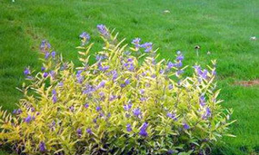 金叶莸耐土壤瘠薄,萌蘖力强。枝紫红色,圆形,叶披针形,叶缘锯齿。有一定耐寒性,喜光,可作为观叶、观花植物。它色感效果好,春夏一片金黄,秋天蓝花一片。在园林绿化中适宜片植,做色带、色篱、地被也可修剪成球。观赏价值高。