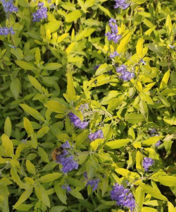 金叶莸(学名:Caryopteris×clandonensis."Worcester Gold"):是人工培植的落叶灌木,马鞭草科莸属植物,叶片金黄色,从展叶初期到落叶终期,从基部到穗部,叶片始终遗片金黄色,一个极具观赏价值的花灌木树种。单一造型组团或与红叶小檗、侧柏、桧柏、小叶黄杨等搭配组团,黄、红、绿,色差鲜明,组团效果极佳。特别在草坪中,流线型大色块组团,亮丽而抢眼,常常成为绿化效果中的点睛之笔。