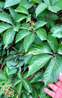五叶地锦(学名:Parthenocissusquinquefolia(L.)Planch.)是葡萄科,地锦属木质藤本植物。小枝圆柱形,无毛。卷须顶端嫩时尖细卷曲,叶片掌状,顶端短尾尖,基部楔形或阔楔形,边缘锯齿,上面绿色,下面浅绿色,两面无毛,网脉不明显;叶柄无毛,多歧聚伞花序,花蕾椭圆形,萼片碟形,无毛;花瓣,花药长椭圆形,花盘不明显,子房卵锥形,果实球形,种子倒卵形,6-7月开花,8-10月结果。原产北美。中国东北、华北各地栽培。