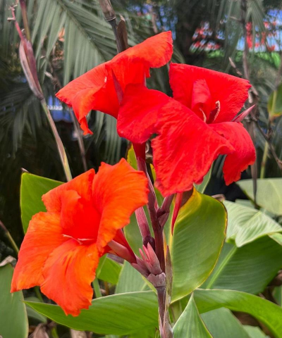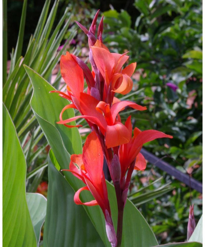 大花美人蕉(Canna×generalis L.H.Bailey):多年生草本植物,株高可达100厘米-150厘米,根茎肥大有块状的地下茎;叶大,螺旋状排列,有明显的中脉和羽状的平行脉,叶柄呈鞘状抱茎,无叶舌,叶柄呈圆形,绿色或紫红色;茎叶具白粉,叶片阔椭圆形。花朵较大,可达20厘米大小,花瓣直伸,具4枚瓣化雄蕊,花色有乳白、黄、桔红、粉红、大红至紫红。