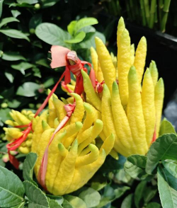 果实手指状肉条形,重可达2000克,果皮淡黄色,粗糙,果皮甚厚,难剥离,内皮白色或略淡黄色,棉质,松软,瓢囊10-15瓣,果肉无色,近于透明或淡乳黄色,爽脆,味酸或略甜,有香佛手掌气;种子小,平滑,子叶乳白色,多或单胚。通常无种子。花期4-5月,果期10-11月。