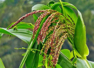 玉蜀黍的雌花序是圆柱状,在叶腋内抽出圆柱状,雌花序外包有多数鞘状苞片,雌小穗密集成纵行排列于粗壮的穗轴上,颖片宽阔,先端圆形或微凹,外稃膜质透明。花、果期7-9月。
