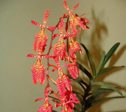 火焰兰(学名:Lour.):茎攀援,粗壮,质地坚硬,圆柱形,长1米以上,粗约1.5厘米,通常不分枝。叶二列,斜立或近水平伸展,舌形或长圆形。花序与叶对生,常3-4个,粗壮而坚硬,圆锥花序或总状花序疏生多数花;花火红色,开展;花瓣相似于中萼片而较小,先端近圆形,边缘内侧具桔黄色斑点;唇瓣3裂。花期4-6月。