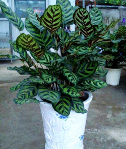 孔雀竹芋(Goeppertia makoyana):竹芋科,肖竹芋属多年生常绿草本植物。植株挺拔株高可达60厘米。叶柄紫红色,叶片薄革质,卵状椭圆形,叶面上有墨绿与白色或淡黄相间的羽状斑纹,就像孔雀尾羽毛上的图案,因而得名。叶片亦有特性:白天舒展,晚间折叠起来。