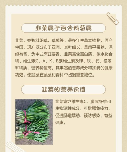 据《中医大辞典》记载,韭菜叶辛、温,入肝、胃、肾经,温中,下气,散血,可治胸痹,噎膈,反胃,吐血,消渴,盗汗等多种症状。
