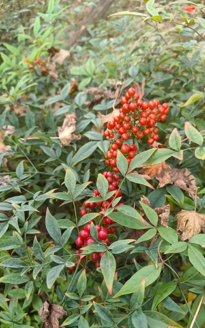 南天竹(Nandina domestica Thunb.),小檗科南天竹属常绿小灌木植物,茎干较高,表面光滑无毛,红色;叶较小,叶片薄,呈椭圆形且为深绿色,无毛;花朵较小,白色带有芳香,呈四角形;果柄短且果实呈球形,橙红色;种子扁圆形。花期3-6月,果期5-11月。最早有记载是在宋代的《图经本草》,小名叫“南天烛”,到了明朝的《通雅》,改芳名为“南天竹”。