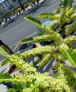 树冠挺拔苍翠,叶背覆有白色鳞片。在阳光照射下,银白与碧绿相映生辉,风姿绰约。橄榄是圆锥花序,每个花序着生金黄色小花10~20朵,清香扑鼻。