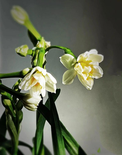 白天水仙花盆要放置在阳光充足的向阳处给予充足的光照。因为植物需要通过叶绿素经过光合作用提供养分,这样才可以使水仙花叶片宽厚、挺拔,叶色鲜绿,花香扑鼻。反之,则叶片高瘦、疲软,叶色枯黄,甚至不开花。以疏松肥沃、土层深厚的冲积沙壤土为最宜,pH在5~7.5时均宜生长。