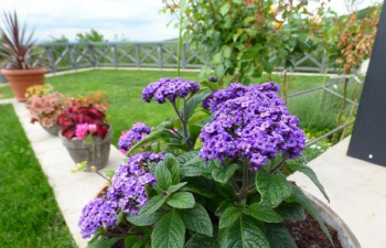 香水草又叫南美天芥菜,南美天芥菜(Heliotropium arborescens L.),为紫草科天芥菜属的植物。多年生草本,株高30-50厘米。茎直立或斜升;叶片卵形或长圆状披针形,先端渐尖,基部宽楔形,上面粗糙,下面柔软;镰状聚伞花序顶生,花冠紫罗兰色或紫色,稀白色,芳香,花药卵状长圆形;子房圆球形,无毛,花柱明显,柱头较花柱稍长;核果圆球形,无毛,成熟时裂为4个具单种子的分核;花期2-6月。