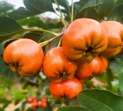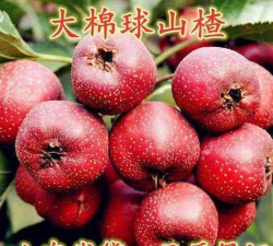 大绵球山楂,果实扁圆形,果皮桔红色,果个较大。果肉黄绿色,质地松软细密。树势中庸,枝条开张,早春萌芽时新梢叶片呈红色。