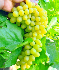 无核白葡萄又名“无籽露”,中晚熟鲜食品种,味道很甜,制干品质优良,也可酿酒。嫩梢绿色,有光泽。幼叶薄,黄绿带橙黄色,叶面有光泽,上、下表面均光滑无绒毛。一年生成熟枝条黄褐色。成龄叶片中等大,圆形,5裂,上侧裂中等深,下侧裂浅,叶片尖端锯齿锐,叶边缘锯齿较钝,叶片薄,黄绿色,两面均平滑,叶柄洼闭合成裂缝形或楔形。卷须间隔性。两性花。