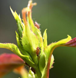 月季:蚜虫常密集在新梢和花苞上,导致叶片卷曲、生长停滞。