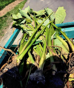 (3)结芋期管理:要适施母芋膨大肥,以免造成中后期疯长,不利于地下球茎膨大,影响芋头质量和品质,一般在7月上中旬,每亩畦面撒施高浓度复合肥30公斤;巧施长子肥,一般在8月下旬至9月上旬,看苗亩施尿素7—8公斤。由于这期间母芋要膨大,需大量的肥水才能满足生长需要,因此要看天气每隔5—7天灌水一次,灌水量达到垄高的4/5左右;灌水时间宜选择上午和傍晚进行(注意:高温季节不能在中午灌水,否则会出现煮不熟的“水晶芋”)。